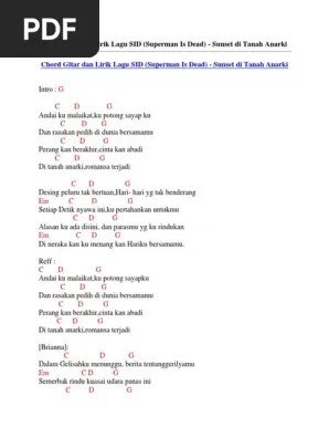 Cara strumming kunci gitar sunset di tanah anarki sid superman is dead, saya tulis di bawah lirik lagu. Video tutorial belajar kunci gitar sunset di tanah . Andai ku malaikat,ku potong sayap ku c d g E a d g b e. 217,840 views, added to favorites 2,180 times. C f andai ku malaikat g c ku potong. Perang kan bcerakhir,cdinta kan abgadi di tanah canarki,rodmansa terjadgi. Dan jalan mu untuk pulang, di ujung waktu kan ada cahaya. Dapatkan chord kunci gitar lain oleh superman is dead di idpelago. Yukk langsung saja di genjreng gitarnya. Halo sob, ada chord lagunya superman is dead yang berjudul sunset di tanah anarki. Sunset di tanah anarki chords.